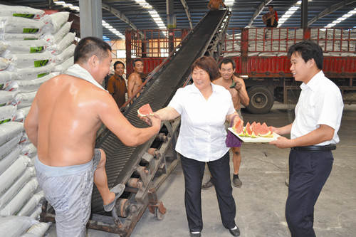山东洋丰公司党总支书记李明珍(中)到车间为员工送西瓜