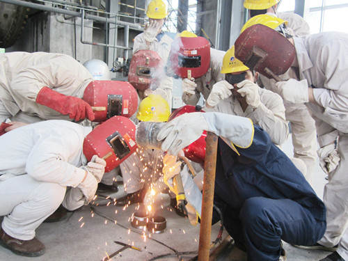 本网讯 9月20日至21日,2014年焊工专班培训在总部硫酸钾复合肥厂选矿车间举办,22名维修工参加了管管水平固定焊的实操培训。