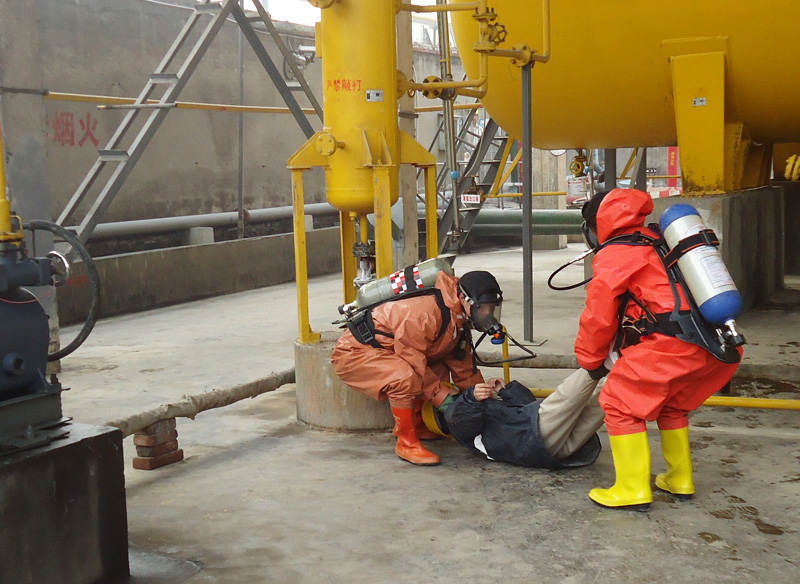 液氨泄露演练中,在厂长孙华山宣布启动应急预案的那一刻开始,参加演练的员工迅速进入警戒状态,他们积极参与、紧密配合,一气呵成地完成了抢救伤员、疏散职工、设备抢修、消防稀释等应急措施。演练活动仅用时8分钟,就把环境污染突发事故彻底消除,达到了预期的演练效果。